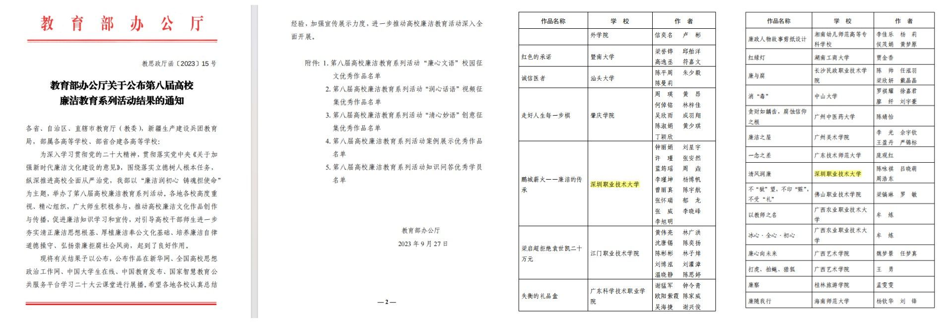 近日,教育部辦公廳公布了第八屆高校廉潔教育系列活動結果。我校報送的《鵬城薪火——廉潔的傳承》獲評“潤心話語”視頻征集優秀作品(全國高校共100件),《清風潤廉》獲評“清心妙語”創意征集優秀作品(全國高校共100件)。獲獎作品將在新華網、全國高校思想政治工作網、中國大學生在線、中國教育發布、國家智慧教育公共服務平臺學習黨的二十大云課堂進行展播。